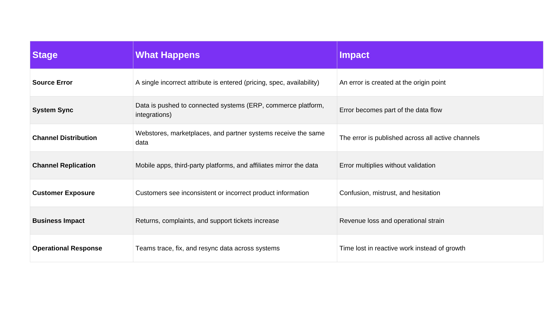 In modern digital commerce, product data is continuously distributed across multiple systems and channels. Once an error enters the flow, it doesn’t stay isolated; it gets replicated, synced, and published everywhere the product exists.